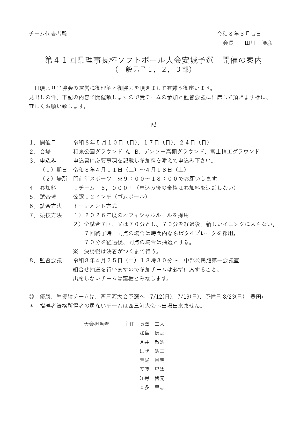 【案内】第48回安城市会長杯争奪ソフトボ-ル大会(一般男子・壮年)