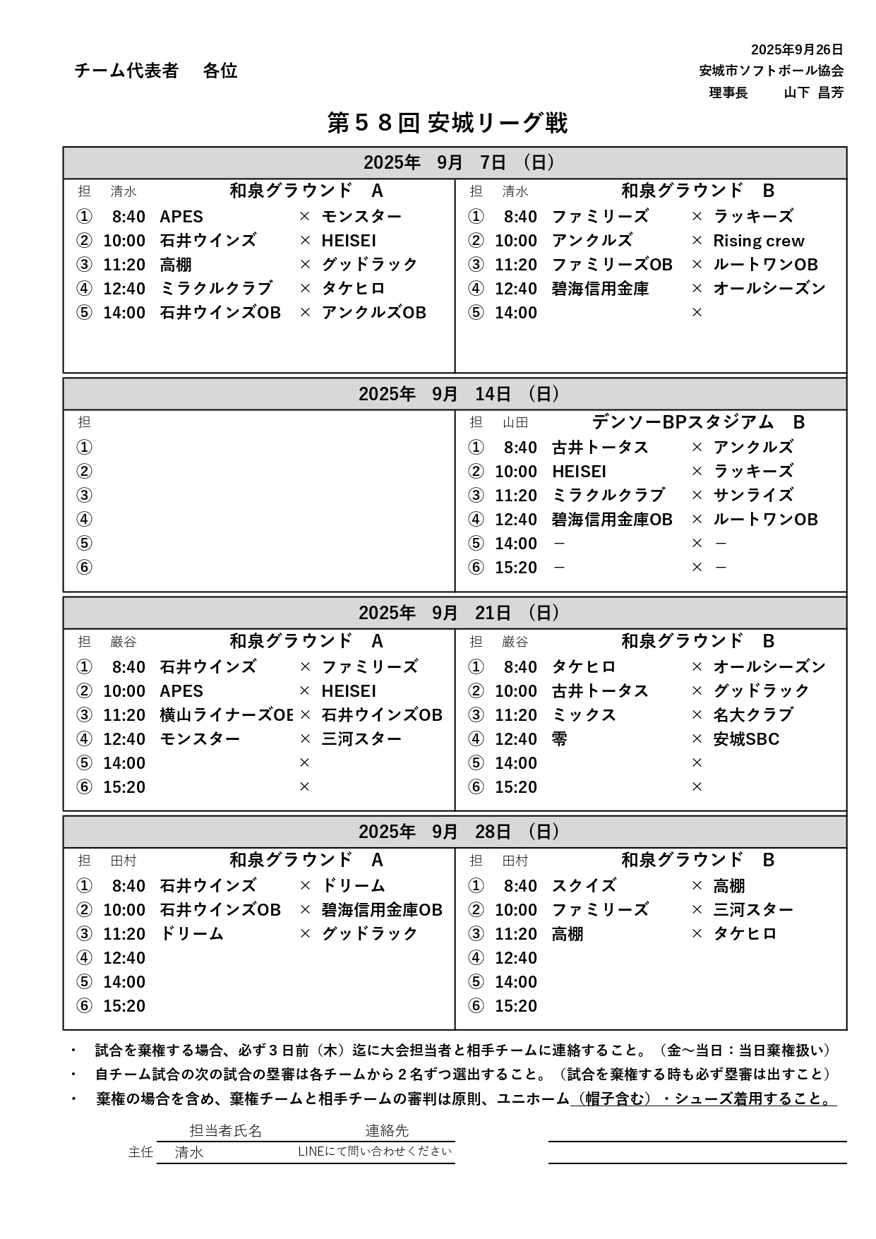 ◆雨天などの状況により10月にリーグ戦を組む可能性があります。