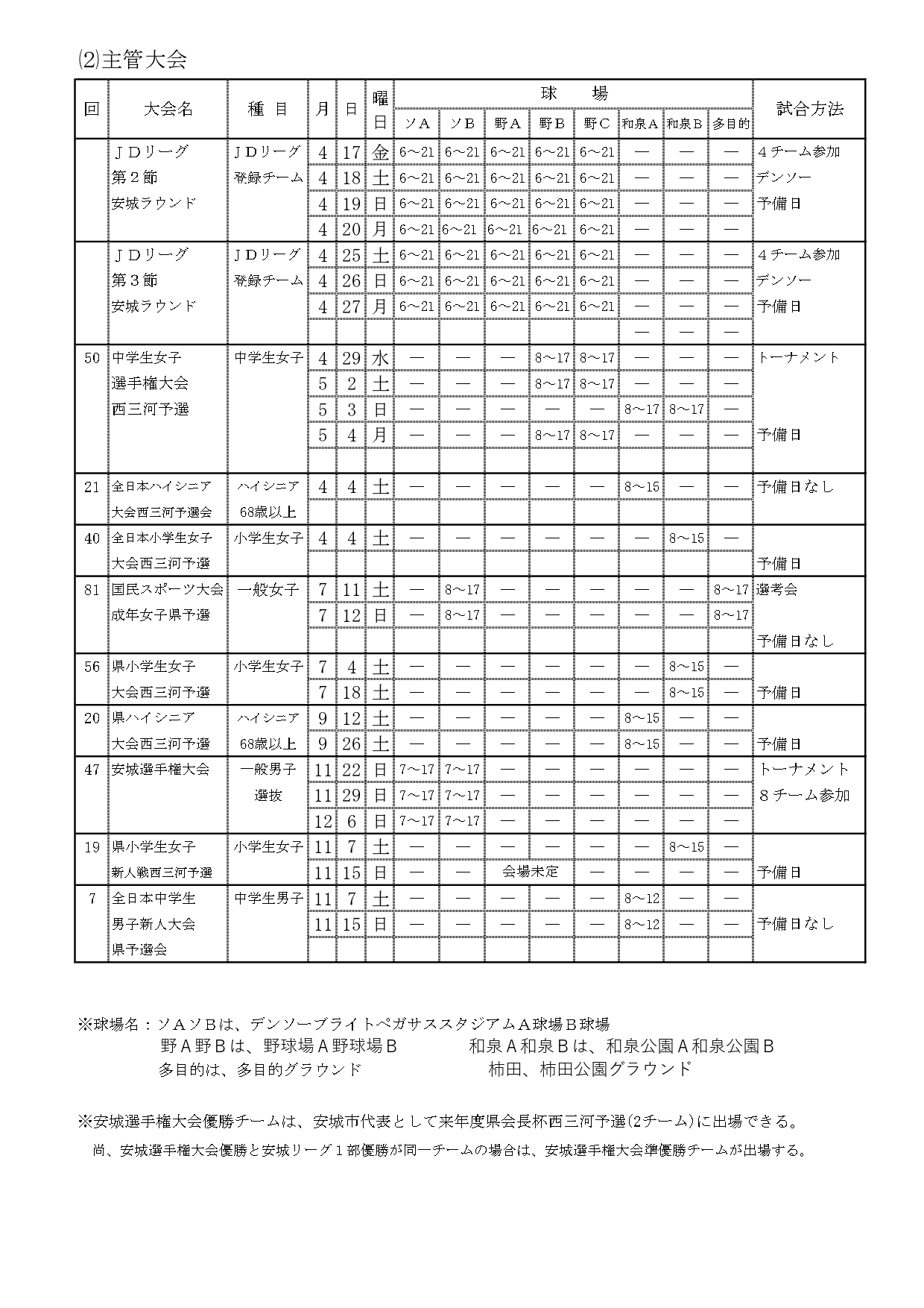 安城リーグ戦球場担当 当番表
