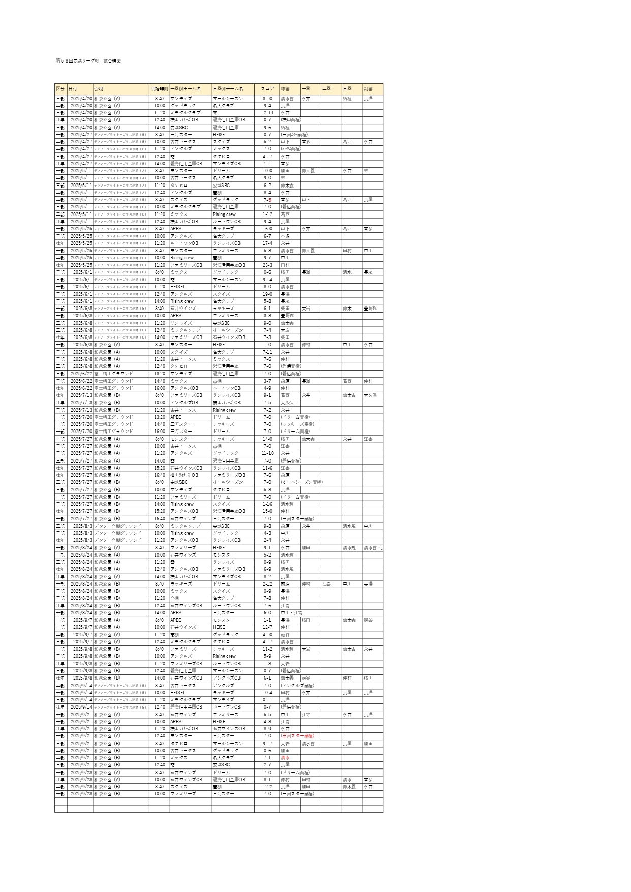 第58回 安城リーグ戦結果(各日程毎)