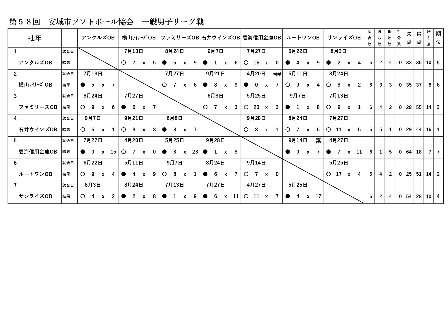 第58回 安城リーグ戦結果(星取表壮年)
